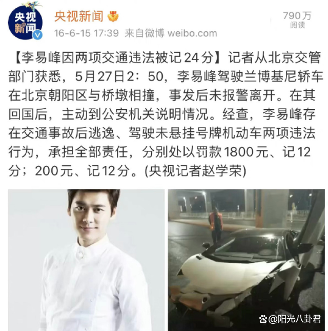2016年某天凌晨2点多,李易峰驾驶一辆兰博基尼在北京朝阳区某地出现了严重车祸,从当年公开的车祸现场照片来看,李易峰的兰博基尼前脸基本被撞报废,虽然此次没有造成人员受伤,但造成了公共设施损坏。
