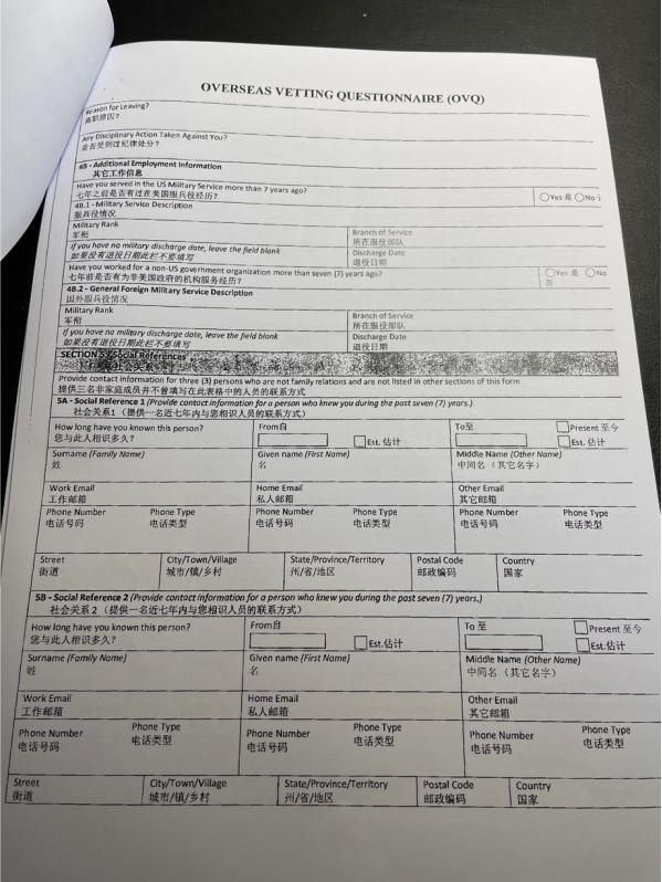 《环球时报》记者近日获得的一份名为《海外背景调查问卷》(Overseas Vetting Questionnaire)的表格,即为李明和赵平提到的“安全背景调查”的重要内容。该表格分为“填表说明”和“正式表格”两部分,其说明部分一方面提到“提供信息为自愿行为”,却紧接着出现一段颇具威胁意味的文字:“但如果您不提供所需的相关信息,您的背景调查将无法完成,由此会影响您获得联邦合同雇佣关系或相关需要一定逻辑能力以及身体素质才能获取的权限……故意隐瞒、误报,提供虚假信息将影响您获取或延续联邦合同雇佣关系……还将导致对您的职业发展、工作状态产生负面影响,包括但不限于解除雇佣关系或被起诉。”